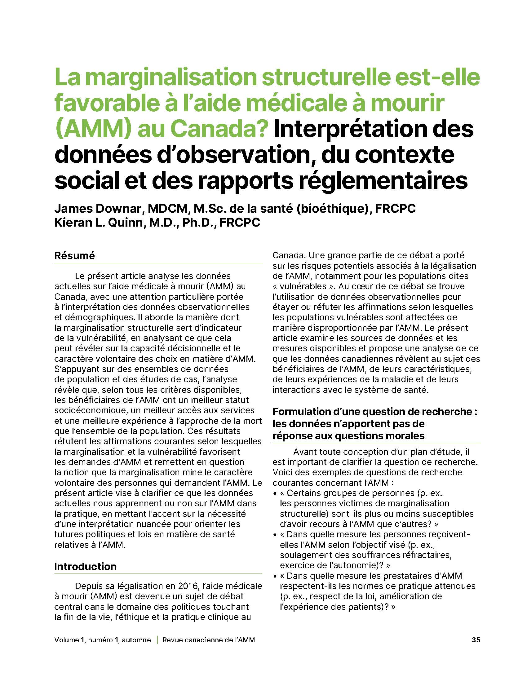 - La marginalisation structurelle est-elle favorable à l’aide médicale à mourir (AMM) au Canada? Interprétation des données d’observation, du contexte social et des rapports réglementaires