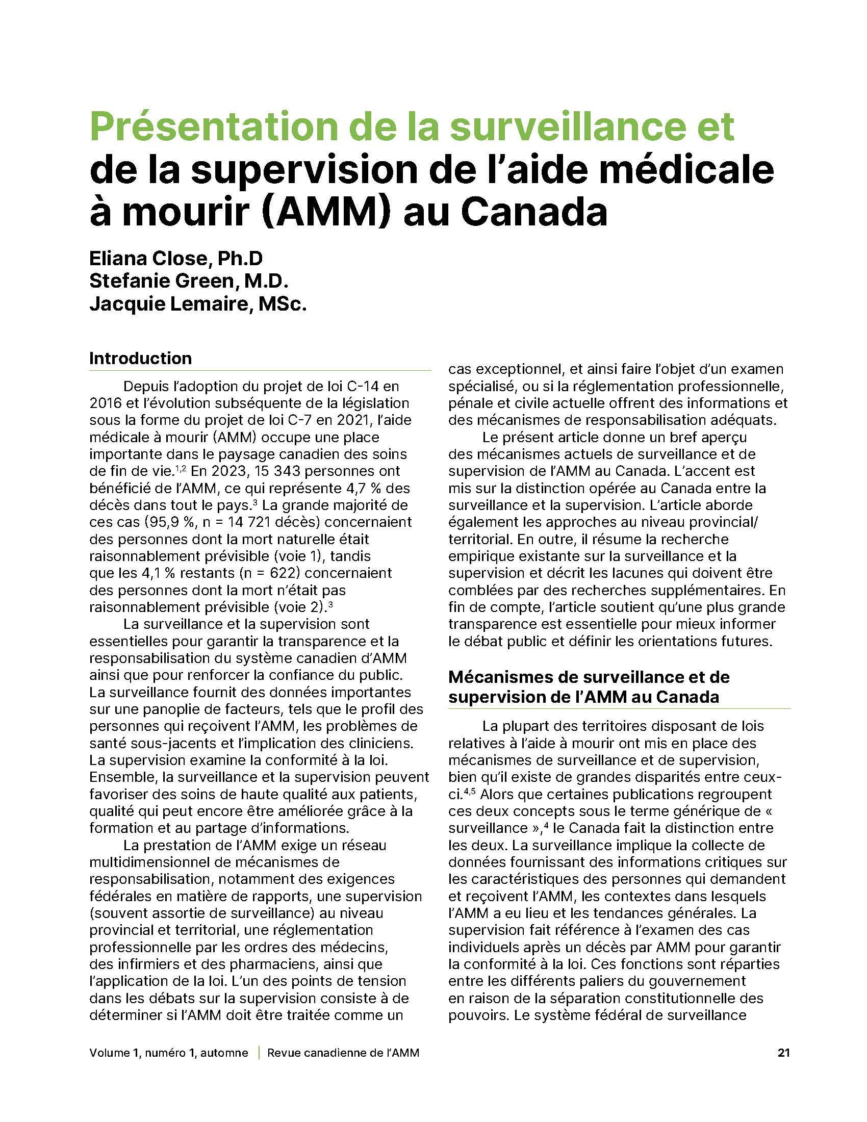 - Présentation de la surveillance et de la supervision de l’aide médicale à mourir (AMM) au Canada